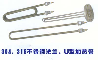 不銹鋼法蘭、U型加熱管法蘭間用襯墊密封。在耐高溫不銹鋼無縫管內均勻地分布高溫電阻絲,在空隙部分致密地填入導熱性能和絕緣性能均良好的結晶氧化鎂粉,這種結構不但先進,熱效率高,而且發熱均勻,當高溫電阻絲中有電流通過時,產生的熱通過結晶氧化鎂粉向金屬管表面擴散,再傳遞到被加熱件或水中去,達到加熱的目的。